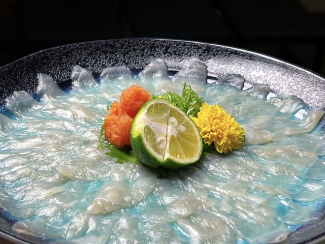 Pufferfish, a luxury fish in season during winter. It’s famous for being highly poisonous, but since only chefs with specialized licenses are legally permitted to prepare it, fugu eaten in Japan is absolutely safe. Sashimi cut as thin as paper, called “Tessa,” offers a unique texture and refined taste, making it an ultimate delicacy worth trying.